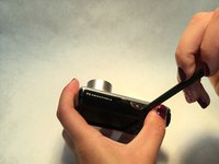 Inserting the prying tool as shown, gently separate the front and back pieces of the camera exterior.