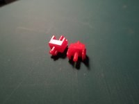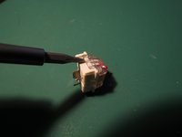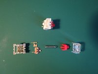 • The keycap connector is injection moulded red ABS. The spring is thinly extruded and coiled steel. Finally, the pins are stamped, pressed, and bent from copper sheet. These components all fit within the spring housing.