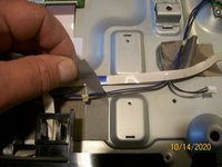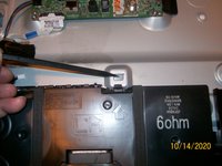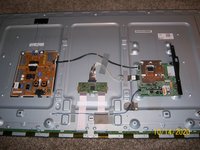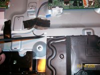 Back of set after rear cover removed. Bottom of TV at bottom of photo. The two speakers were removed by pulling up after disconnecting plug. Next is to remove the lower black panel that houses the power button and speaker mounts.