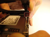 Skip this step if the screen display connector is already detached from the motherboard. Using a spudger, insert the pointed end between the plastic end of the wire and the motherboard socket, then carefully lift or push the wire to disconnect it. You should see two golden pins protruding from the plastic connector.