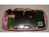 The small rectangular charging port cover may disconnect as well. This is okay; just set the cover aside with the screws, battery, and back cover.