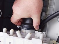 Use slip joint pliers to gently rotate the detergent dispenser hose back and forth around its connection and loosen it.