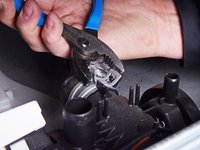 Use needle nose pliers to grip the spring end of the metal ring at the bottom of the rubber boot.