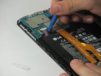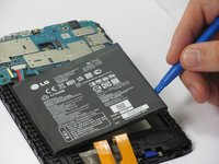 Use the plastic opening tool to pry up the battery. There is adhesive underneath the battery, so use a small amount of force. Work your way around the edge of the battery to pry it off.