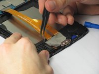 Using the tweezers, remove the orange ribbon cable along with the charging port.
