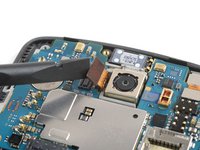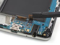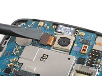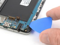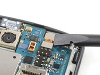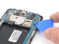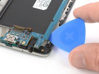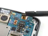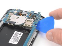 Slide the opening pick under the right edge of the motherboard where the SIM card slot is located and pry it up by rotating the opening pick sideways.