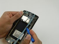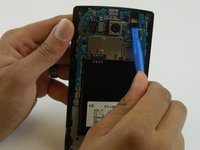 Gently wedge the plastic opening tool under the ribbon where the rear camera cable is connected, and slowly lift up to detach the cable from the mother board.