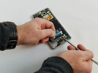 Begin battery removal by very gently prying off the power ribbon with a plastic card or a nylon spudger.