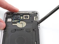 Be careful as you slice and pry to the left side of the fingerprint sensor, as seen from the outside of the phone in the third photo.
