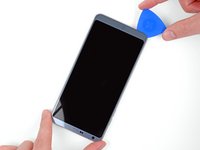 Carefully slide an opening pick across the top edge of the phone, separating the last of the adhesive securing the rear glass panel.