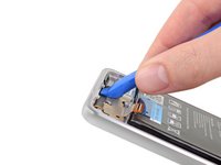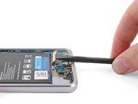 Place the flat end of an opening tool against the lower edge of the inside of the phone below the battery, as shown in the first photo.