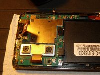 Remove the SIM and SD card board. You removed the pin next to the SD card tray already and you can see the glue on the board on this picture. Also remove the (whole!) pin between the cameras, circled in red.