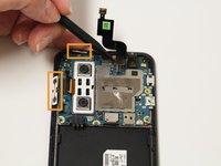 The button tabs, highlighted in orange, are held in with a light adhesive. Gently lift them out of the body of the phone with a spudger.