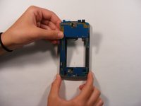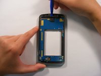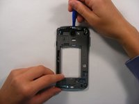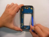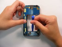 Using the plastic opening tool, work your way around the perimeter of the blue motherboard to loosen it from the body of the phone.