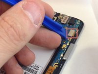 Locate the ribbon cables in the top right corner of the motherboard. Using the plastic opening tool, remove the ribbon cables from phone.