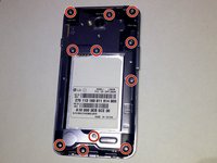 Once the back cover and battery are removed, use the Phillips #J000 screwdriver to remove all 11 screws located around the plastic midframe.