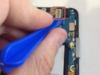 Locate the front facing camera in the top left hand corner of the motherboard. Using the plastic opening tool, separate the ribbon cable from the phone.
