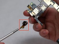Once the motherboard is completely off, set the phone to the side and focus on the small black box with a square tail (which is the front camera).