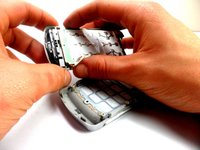 Hold the phone casing with one hand and the keypad assembly with the other.