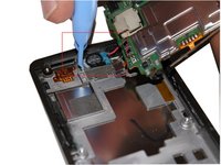 The LCD screen is connected to the bottom of the logic board. Once you lift the logic board use tweezers or a safe prying tool to disconnect the ribbon wire from the LCD screen to the logic board.