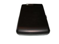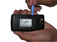 On the right hand side of the LG Versa there is a latch to open up the back of the cell phone. Push the latch up and lift off the back of the phone exposing the battery.