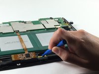 Flip the tablet so the screen is facing upward, and use the metal spudger to pry apart the screen from the side pieces.