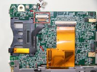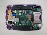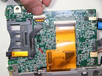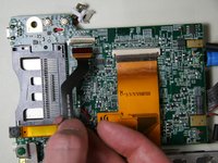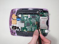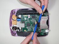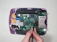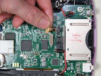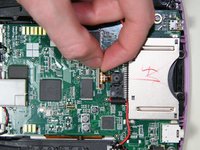 Slide the motherboard in the direction of the game cartridge slot until the motherboard is out from under the metal tabs on the screen assembly.