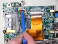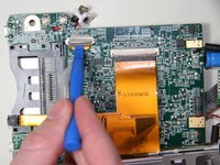 Place one opening tool directly under the base of the camera ribbon cable and camera body, applying upward pressure.