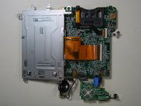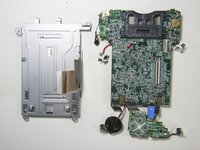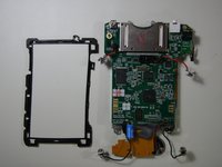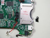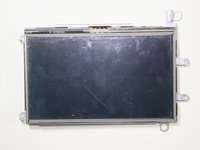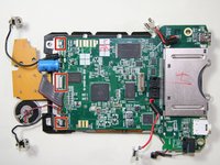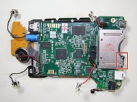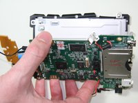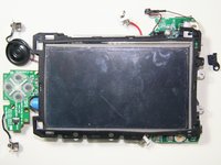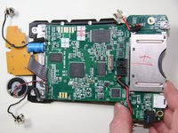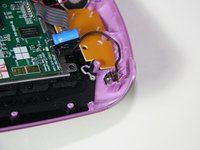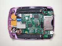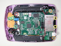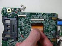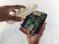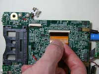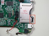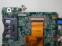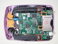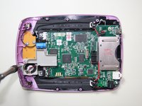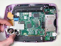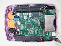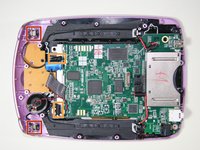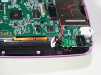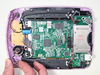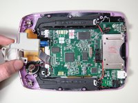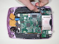 Slide the motherboard in the direction of the game cartridge slot until the motherboard is out from under the metal tabs on the screen assembly.