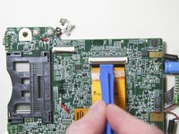 Carefully flip the motherboard over by pivoting away from the screen assembly along the long edge with the microphone and speaker, as shown.