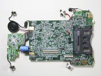 Slide the motherboard in the direction of the game cartridge slot until the motherboard is out from under the metal tabs on the screen assembly.