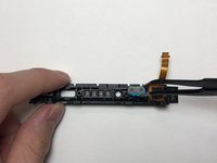 • Use tweezers to insert the ribbon cable for the mid-frame into the ZIF connector on the motherboard, with the golden pins facing upwards.