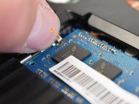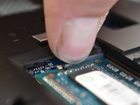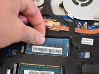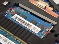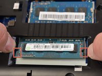 Lower RAM stick is removed the same way as the first. Pull two spring clips on either side away from RAM stick to release it.