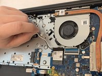 Gently move the wires wrapped around the fan that run along the left side of the cooling fan.