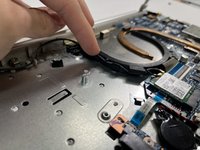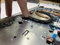 The heatsink component has two wires that are tucked into the sides, which are grey and black. It is important to treat these with care as they are connected to the computer's network adapter, which is the green chip below it.