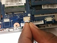 Using your fingers, unplug the large connector that connects the keyboard to the center of the laptop by sliding the end of the strip out of the socket.