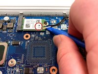 Using an opening tool, lift up on the black and white coaxial cables on the Wi-Fi card and gently pull upward to unplug them.