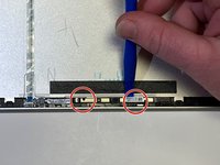 Using an opening tool, carefully flip up the retaining flaps holding the silver video cable in place.