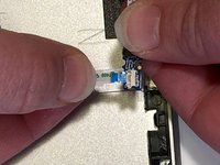 Using an opening tool, flip up the retaining flap that holds the connector to the thin black ribbon cable at the bottom of the motherboard.