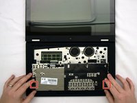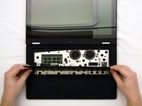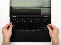 Lift the keyboard bezel off the laptop. The bezel is secured to the chassis by 10 plastic clips around the circumference that can be released with the plastic pry tool.
