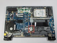 Locate the wireless card. It is located above the black ribbon cable, underneath the battery terminals.