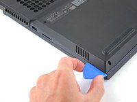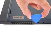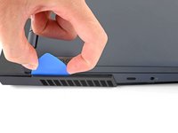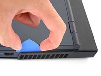 Slide the opening pick between the frame and the plastic vents on the right side near the USB-A port.