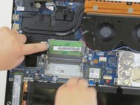 The RAM will now be exposed. There are two tabs holding each one of two RAM cards in place. They are on the sides of the RAM cards. Pull the tabs to release the cards.