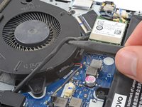 Use the point of a spudger to guide the display cable out of the clips on the bottom edge of the left fan.