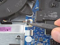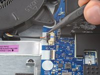 Use the point of a spudger to push on alternating sides of the left fan cable connector to "walk" it out of its socket.