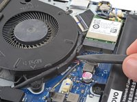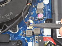 Use the point of a spudger to push on alternating sides of the right fan cable connector to "walk" it out of its socket.