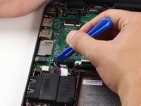 Disconnect the speaker and battery cables from their sockets on the motherboard by using the edge of the plastic opening tool to separate the cable connectors from the sockets.