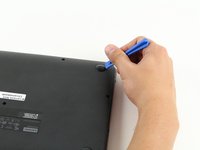 Wedge the plastic opening tool between the rubber foot and the bottom of the chromebook. Lift up the plastic opening tool to remove the foot. This exposes the back end of a screw holding down the motherboard.