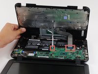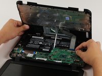Lift the keyboard up and off the back panel, exposing the motherboard and battery.