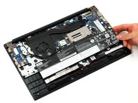 Remove the battery by gently lifting the top of the battery out from the frame and then pull towards the motherboard.